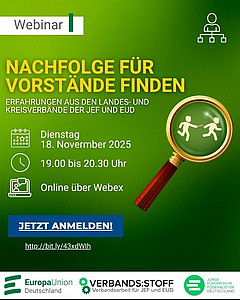 Die Europa-Union Deutschland (EUD) ist die größte Bürgerinitiative für Europa in Deutschland. Unabhängig von Parteizugehörigkeit, Alter und Beruf engagieren wir uns für die europäische Einigung. Wir sind aktiv auf lokaler, regionaler, nationaler und europäischer Ebene. Rund 17.000 Mitglieder sind in 16 Landesverbänden mit rund 300 Kreis-, Orts- und Stadtverbänden vernetzt und haben Partnerorganisationen in über 30 Ländern Europas. Mehr zu unseren Zielen und Aktivitäten.