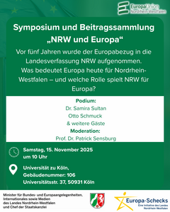 Am Samstag, 15. November 2025, lädt die Europa-Union NRW gemeinsam mit dem Kreisverband Köln zum Symposium „NRW und Europa“ ein. Die Veranstaltung findet von 10 bis 13 Uhr im Neuen Seminargebäude (Gebäude 106, Universitätsstraße 37, 50931 Köln, Raum EG) statt.