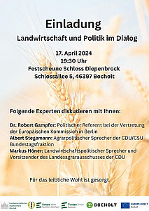 Diskutieren Sie mit Vertretern der EU, des Bundes und des Landes Nordrhein-Westfalen, am 17. April um 19:30 Uhr in der Festscheune des Schlosses Diepenbrock in Bocholt, Schlossallee 5, 46397 Bocholt. Für Getränke und Imbiss ist gesorgt. Anmeldungen gerne unter: europe-direct@bocholt.de (Link siehe unten)!