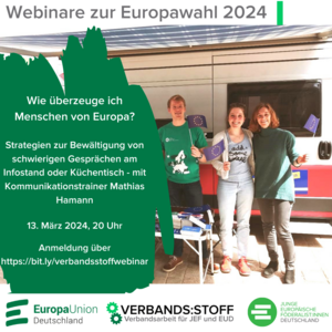 Der Frühling steht vor der Tür und die heiße Phase vor der Europawahl beginnt. Ehrenamtliche werden wieder bundesweit Infostände und Straßenaktionen organisieren. Dabei stellen sich immer wieder dieselben Fragen: Wie überzeuge ich Menschen von Europa? Wie führe ich Dialoge und gehe mit Stammtischparolen, Beleidigungen und unhöflichem oder aggressivem Verhalten um? Das ist oft leichter gesagt als getan. In dieser Ausgabe unserer Webinar-Reihe zeigt uns Mathias Hamann Strategien für Gespräche und Diskussionen mit Menschen vor Ort.