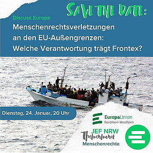 Am Dienstag, dem 24.01. ab 20:00 Uhr findet eine Online-Diskussion zur EU-Politik an den gemeinsamen Außengrenzen statt. Auf dem virtuellen Panel dabei sein werden: Erik Marquardt (MEP, Mitglied des Frontex-Untersuchungsausschusses), Bernd Kasparek (Experte in Migration and Border Studies) Markus Jaeger (Menschenrechtsanwalt mit beruflicher Erfahrung u.a. im Europarat), sowie eine Vertreterin der Seenotrettungsmission SOS Humanity.