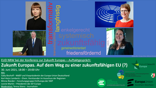 Die Europa-Union NRW beginnt ihre Veranstaltungsreihe zur Zukunft Europas mit einer Podiusmdiskussion. Diese wird am Mittwoch, dem 30. Juni 2021 von 18 bis 20 Uhr online über das Tool Zoom stattfinden. Gäste sind Gaby Bischoff, MdEP und Vizepräsidentin der EUD, Karl-Heinz Lambertz, ehemaliger Vorsitzender im Ausschuss der Regionen, Minna Ålander, Mitglied der Forschungsgruppe EU/Europa der SWP, und Leonie Martin, Präsidentin der JEF Europe. Moderiert wird die Veranstaltung von der Journalistin Teresa Stiens.