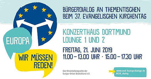 Nach der erfolgreichen Premiere auf dem Katholikentag in Münster im letzten Jahr sind Europa-Union und JEF auch beim diesjährigen 37. Evangelischen Kirchentag in Dortmund mit dabei. Von Donnerstag bis Samstag bieten wir an unserem Stand auf dem „Markt der Möglichkeiten“ in den Westfalen Hallen die Gelegenheit, Europa bei einer Vielzahl von Mitmachaktionen hautnah zu erleben. Am Freitag, den 21.6., sind dann die Bürgerinnen und Bürger gefragt: Unter dem Motto „Europa – Wir müssen reden!“ können Sie direkt mit Experten und…