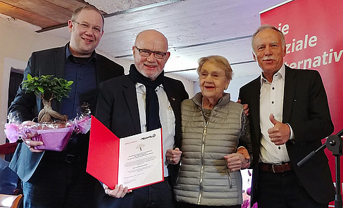 Manfred Klein, Landesschatzmeister und Vorsitzender der Europa-Union in Monheim nahm im urigen Familien-Hofcafé Giebner den Ingeborg-Friebe-Ehrenpreis der SPD für sein ehrenamtliches Engagement entgegen. Er wurde dabei mit so vielen freundlichen Worten bedacht, dass er fast schon verlegen wirkte. Wer kennt ihn nicht, den unermüdlichen Streiter für Haus Bürgel, den geschichtsbegeisterten Monheimer, „der mit seinem Team in aufopfernder Vereinsarbeit diesen Flecken als Weltkulturerbe erhält“, so der begeisterte Laudator Ulrich Anhut…