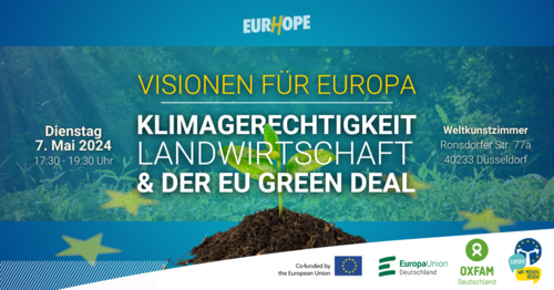 Kommen Sie vorbei zu unserem nächsten Bürgerdialog am 7. Mai 2024 in Düsseldorf! Diskutieren Sie von 17:30 Uhr bis 19:30 Uhr im Weltkunstzimmer Düsseldorf gemeinsam mit Expert*innen aus Politik und Wissenschaft über Klimagerechtigkeit, die europäische Landwirtschaftspolitik und den EU Green Deal.